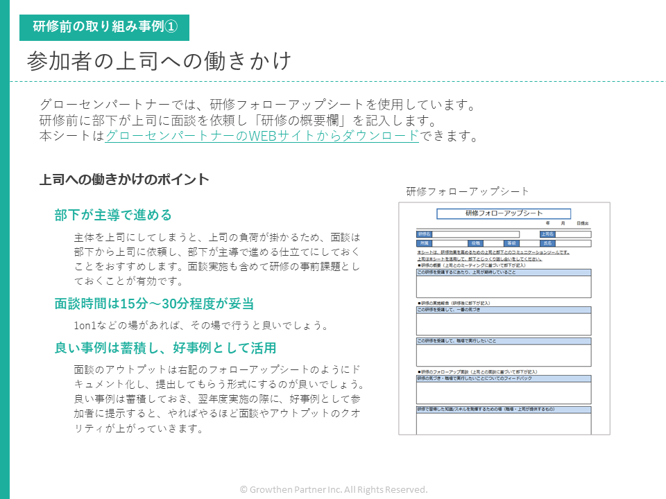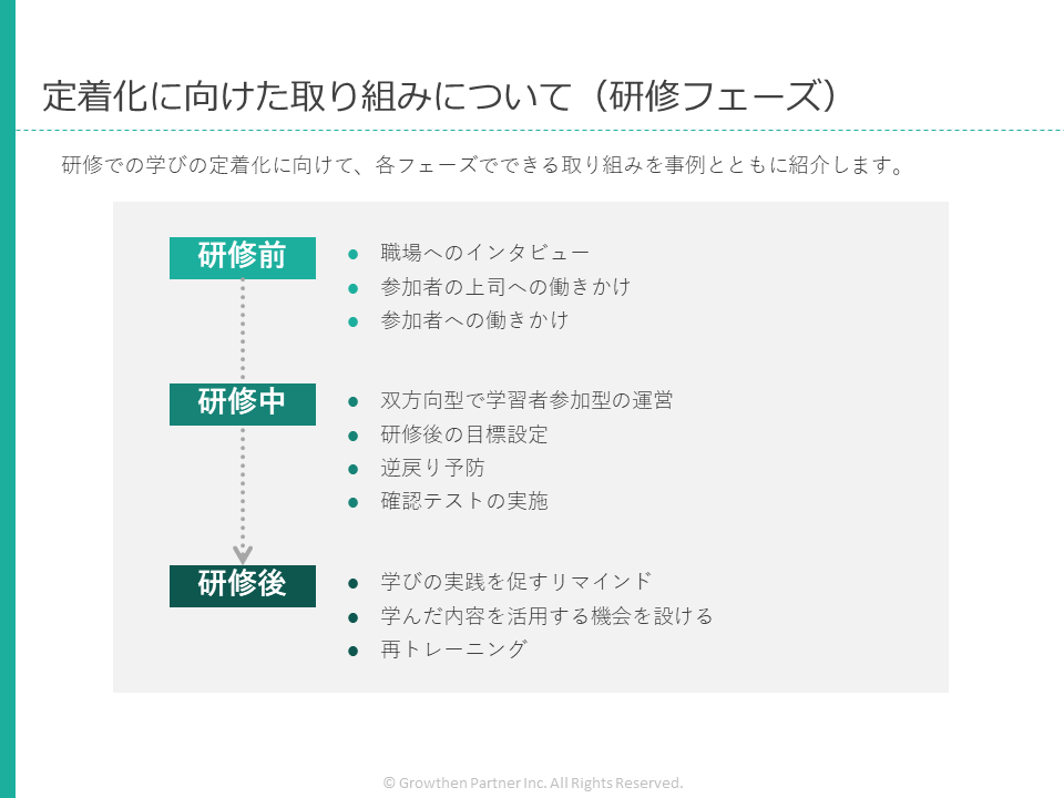研修での学びの定着化に向けて、各フェーズでできる取り組みを事例とともに紹介します。