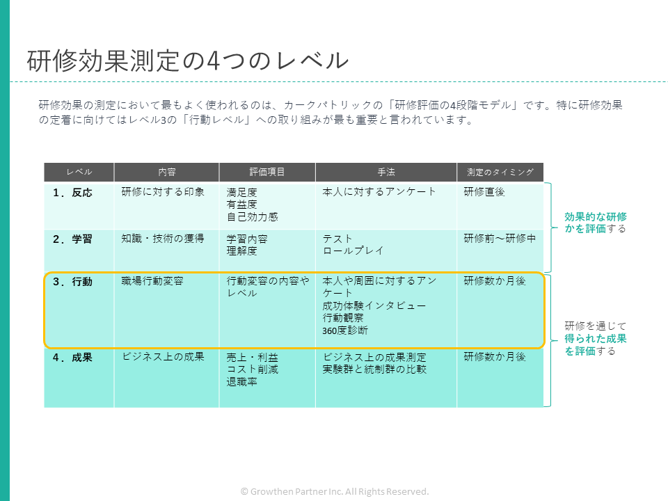 研修の効果測定と定着化についてまとめた約20ページの資料です。「研修を実施する意味があったかどうか?」「翌年度に向けて改善するべき事項は何か?」など、実務に活用できるレベルでは、研修効果測定は実施可能だと考えています。詳細はダウンロードしてご覧ください。