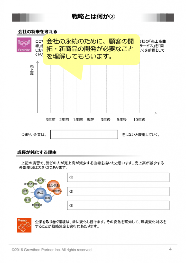 上級管理職向けの研修です。方針の作り手として、戦略とは何か、イノベーションとは何かの理解を深め、実際に活用できるようにイノベーション思考の習得も進めていきます。後半は、環境分析などをしながら、自部門のKPI(重要業績評価指標)の決定方法についても演習します。方針策定に課題がある会社の役員向け・部長向けに研修を実施することをお勧めしています。