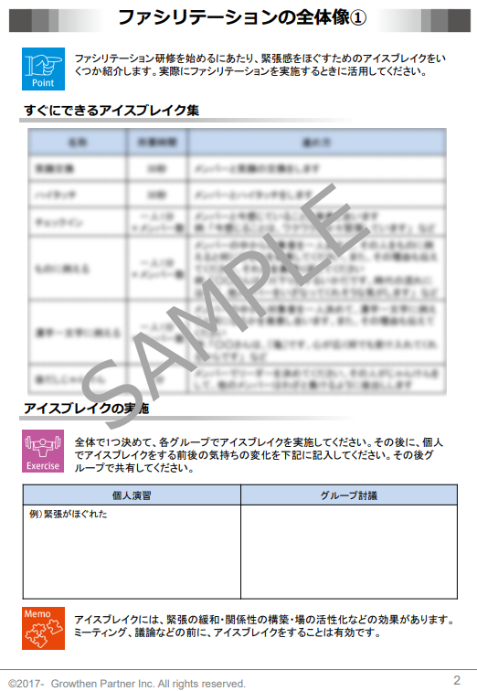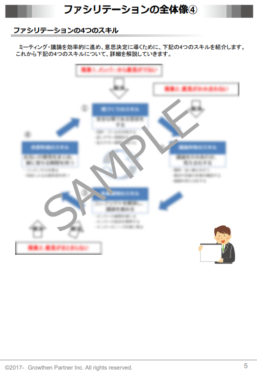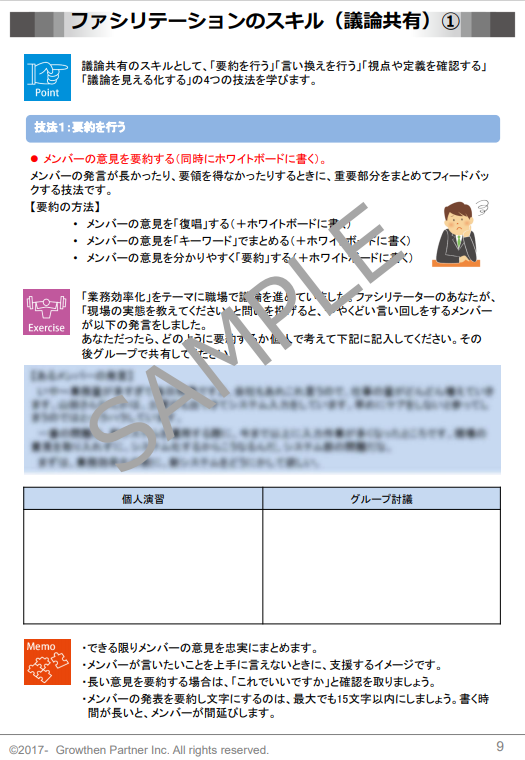 社内研修支援サービス「ファシリテーション(意見の引き出し・合意形成編)」のサンプルテキストです。
