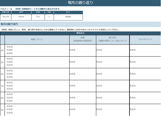 1年・半年などの長期の目標が設定できない企業は、このシートだけ活用しても良いでしょう。毎月「役割は何で」「何をして」「どう振り返ったのか」を記載できれば、役割認識・人材育成面で十分機能しますし、上司・部下とでコミュニケーションも活性化するでしょう。