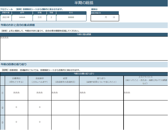 目標設定用のシート、毎月の振り返り用のシート、半期の総括のシートを分けて作成しましたので、それぞれについて解説します。