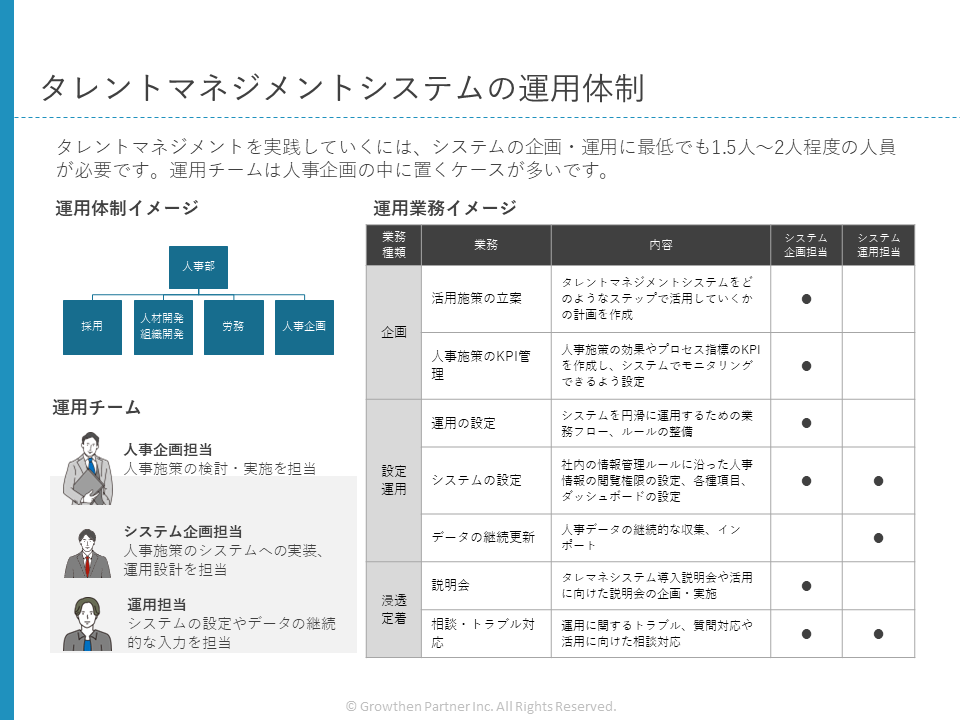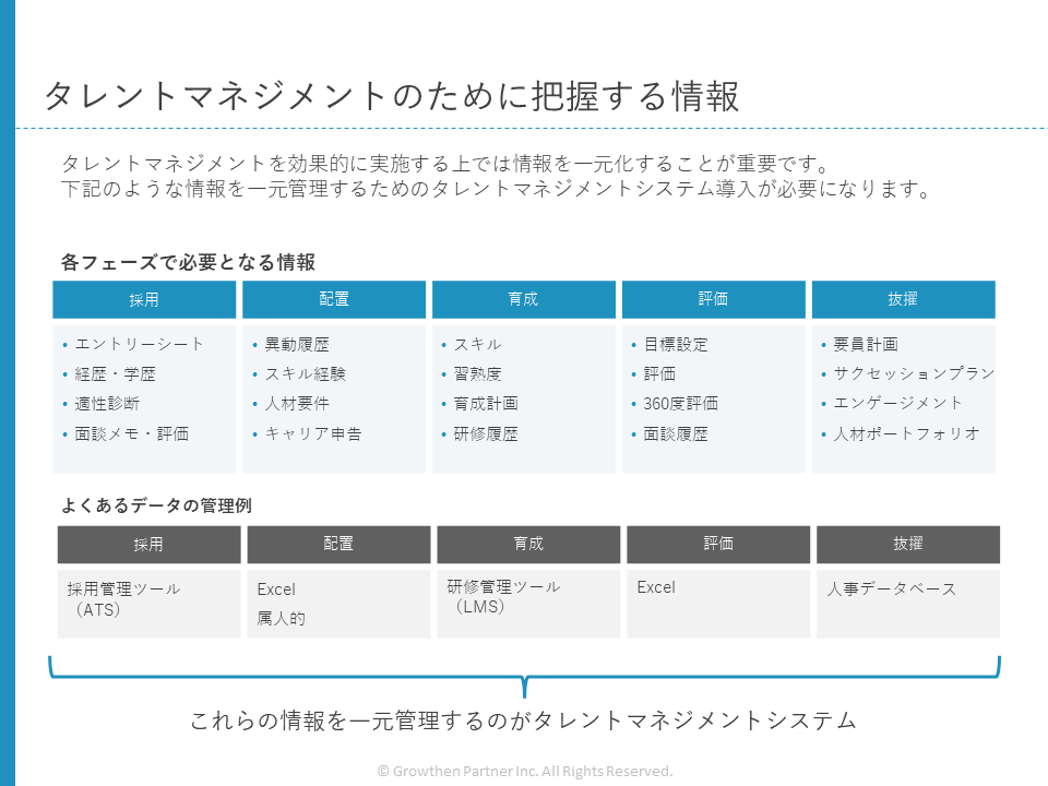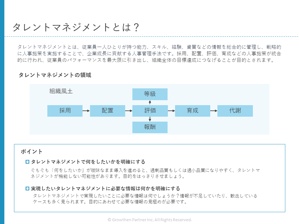 タレントマネジメントは、人材マネジメントの手法の一つで、従業員一人一人が持つ能力やスキル、経験といった情報を、採用や育成、配置に活用することで、企業の成長につなげていくというものです。