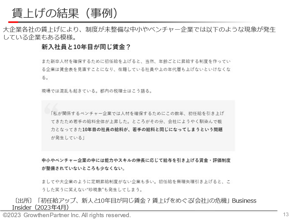 本記事は「2023/04/20開催【夜の楽校】 賃上げ・初任給上げにどのように対応すべきか?賃上げにお悩みの人事担当者と人事制度コンサルタントとの対話で考える」の内容をもとにしています。記事にするにあたり、セミナーの内容や資料を一部省略した部分がありますが、詳細を知りたい方、個別相談(無料)をご希望の方は、こちらからお問い合わせください。