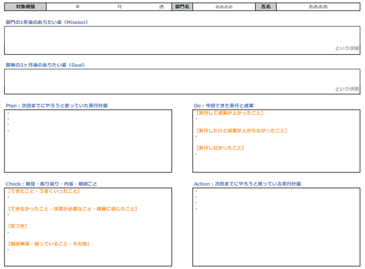 メンバーは、グルリの前に「3か月後のありたい姿」「次回にまでにやろうと思っていた実行計画」「今回の実行と成果」「振り返り・気づき・相談したいこと」「次回までにやろうと思っている実行計画」をグルリシート(振り返りシート)に記入します。振り返りの習慣を定着させることができます。