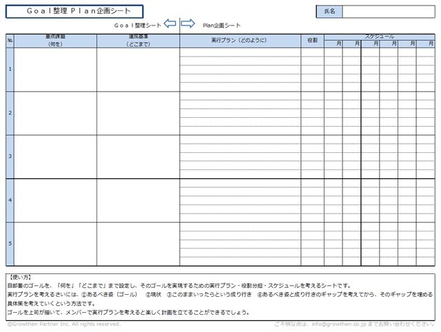 自部署のゴールを、「何を」「どこまで」まで設定し、そのゴールを実現するための実行プラン・役割分担・スケジュールを考えるシートです。