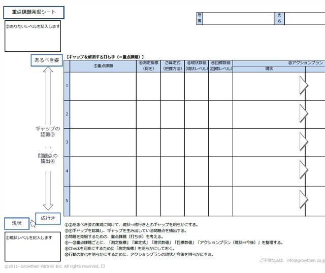 部署のありたい姿から、重点課題(ギャップを解消する打ち手)を発掘するシートです。管理職の目標設定に必要な思考を習得できます。