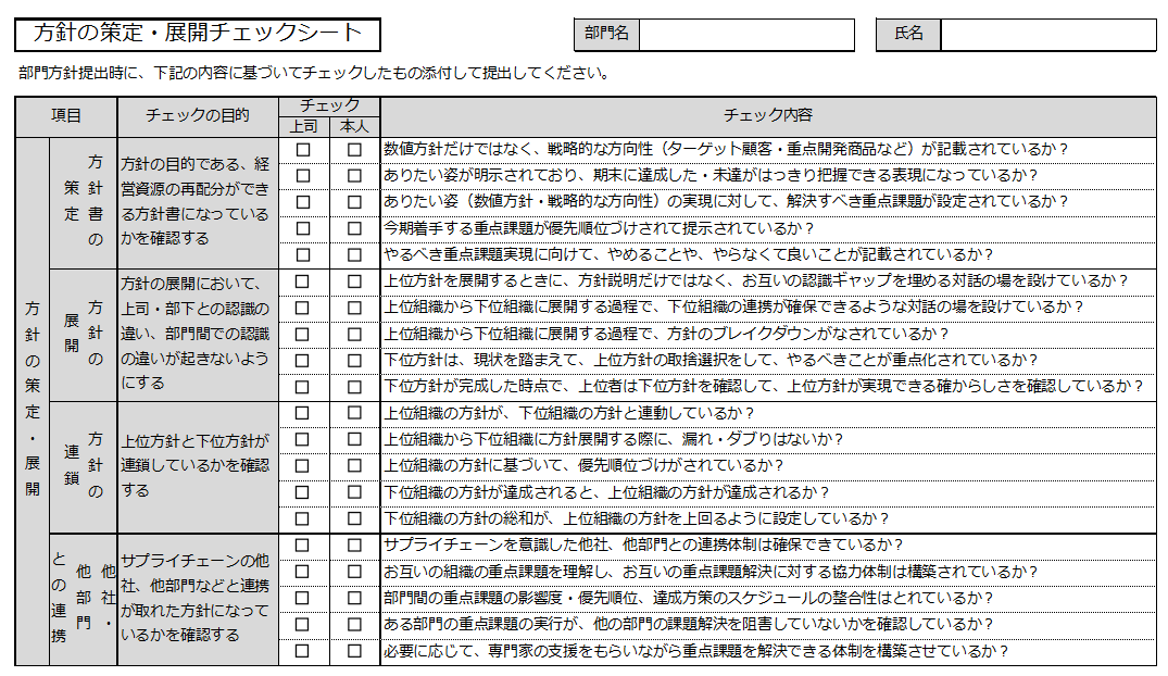 方針を策定・展開する際に考慮すべき点をチェックリストにまとめました。以下の視点に基づいて、本人および上司のチェック欄を設けています。