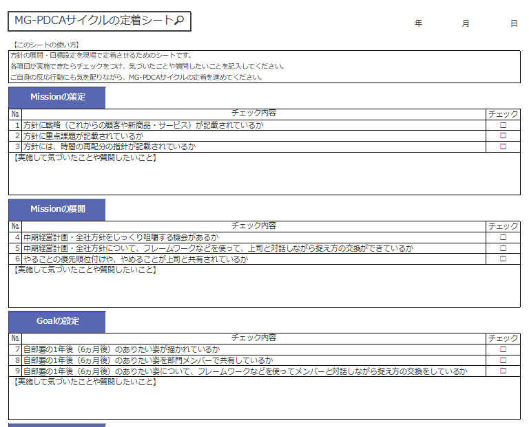 ダウンロード 人事制度構築、研修運用に便利な資料を無料でダウンロードできます。 人事制度 社内研修 マネジメント 新解釈マネジメントの本 MG-PDCAサイクルのチェックリスト 部門方針策定シート 方針の策定・展開チェックシート ありたい姿を描くワークシート 会議の見直し・改廃のための「会議の現状把握シート」 1 / 11 注目のタグ 1on11on1ミーティング360度評価MBOOJTジョブ型タレントマネジメントタレントマネジメントシステムテンプレートペイポリシーマネジメントマネジャー研修人事人事ポリシー人事制度人事評価人材育成人材育成グループコーチング人材育成会議動画で学ぶ人事制度報酬制度多面評価対話型研修のススメ役員ワークショップ心の成長成人発達理論戦略浸透新入社員新解釈マネジメントの本方針展開昇格制度業績評価無料テンプレート目標管理目標設定研修等級制度管理職研修給与制度若手社員評価シート評価制度評価者研修賞与制度退職金制度