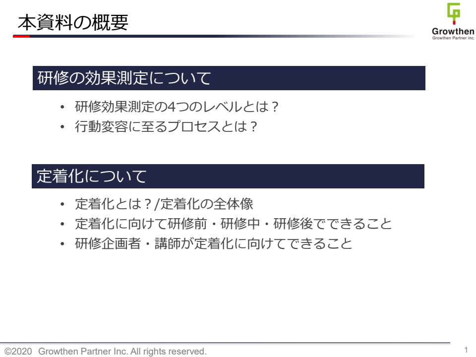 研修の効果測定と定着化についてまとめた約20ページの資料です。「研修を実施する意味があったかどうか?」「翌年度に向けて改善するべき事項は何か?」など、実務に活用できるレベルでは、研修効果測定は実施可能だと考えています。詳細はダウンロードしてご覧ください。