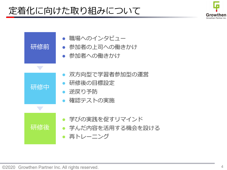 研修での学びの定着化に向けて、各フェーズでできる取り組みを事例とともに紹介します。