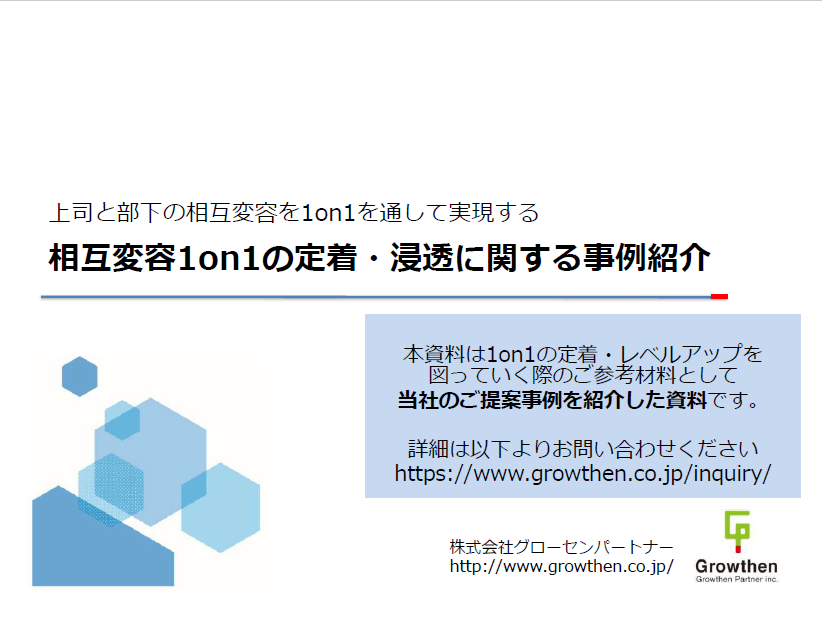 本資料は1on1の定着・レベルアップを図っていく際のご参考材料として、当社のご提案事例を紹介した資料です。1on1の導入や定着に課題をお持ちの方、ダウンロードしてご覧ください。