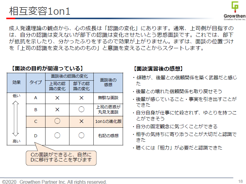 この状態を脱却するためには、まずは上司側に部下の本音を受け入れる度量が必要です。まずは、部下の意見に防衛反応しない状態を作り、だからこそ部下が本音を言え、上司が部下の意見に基づき行動を変容するから、部下にもスペースが生まれて、部下側も変容できるはずです。そもそもの発想を逆にします。1on1への捉え方を「部下の指導のため」から「自分の成長のため」に変えることをねらいにプログラムを作成しました。