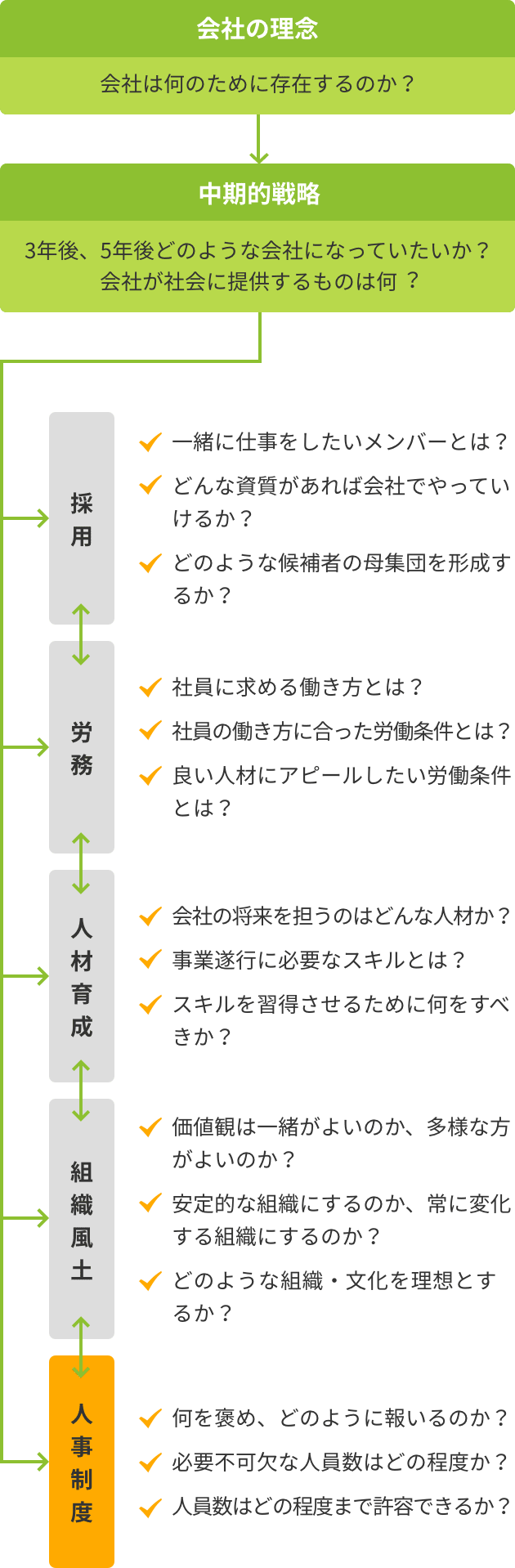 企業の将来像や経営者の意向を理解したうえで、人事ポリシーおよび人事制度の全体構想を提案・共有します。 |