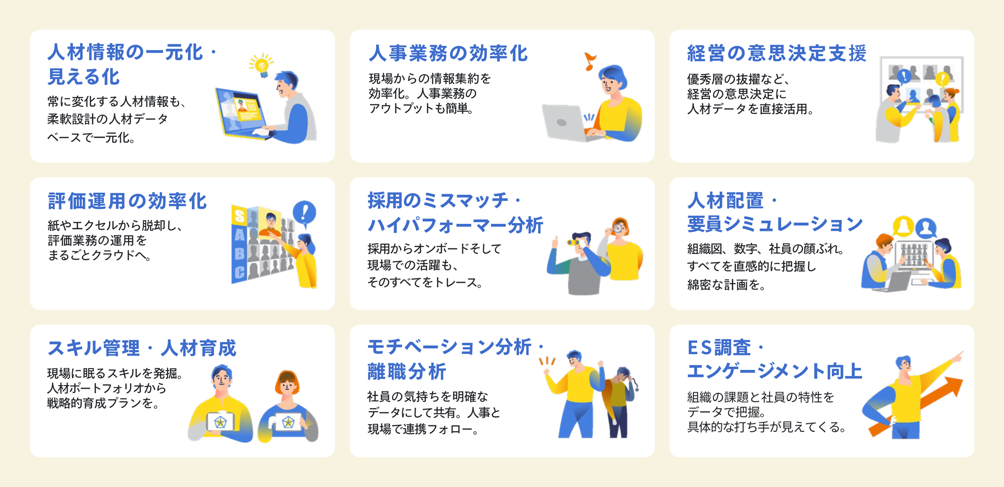 社員の個性・才能を発堀し、戦略人事を加速させるタレントマネジメントシステムです。社員のスキルや評価履歴、さらに性格やモチベーションも一元管理。今まで管理していなかった個々の能力や特性を有効活用することで、会社が抱える様々な課題の解決に繋がります。