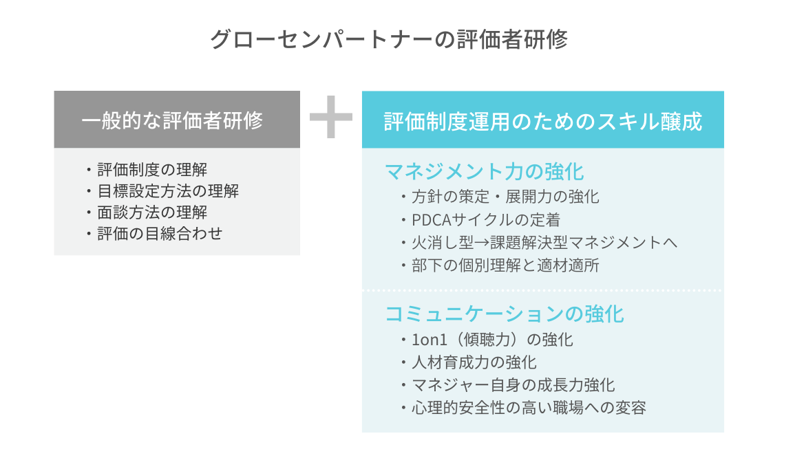 一般的な評価者研修は、評価スキルの向上を目指しますが、グローセンパートナーは、評価制度をマネジメント機能・コミュニケーション機能を強化する手段と捉え、評価制度を運用するためのマネジメント力の強化、コミュニケーション力の強化も含めて評価者研修を設計します。評価者としての役割認識、マネジメントスキル、面談スキルなど向上させたいスキルを明確にし、評価制度の定着・運⽤のために、マネジメントサイクル定着や部下とのコミュニケーション⼒向上を目指します。
