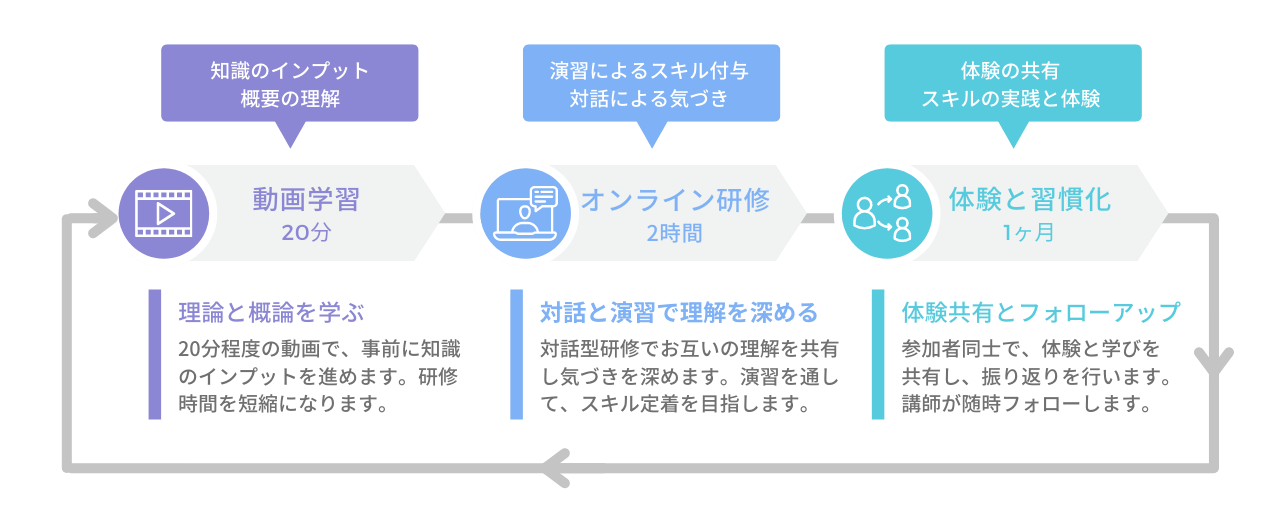 事前学習(動画20分) オンライン研修(2時間) 事後課題