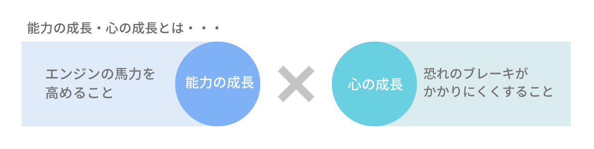 グローセンパートナーのマネジメント研修は、「能力の成長」と「心の成長」の両面からマネジメント力の向上を目指します。「能力の成長はエンジンの馬力を高めること」、「心の成長は恐れのブレーキがかかりにくくすること」という表現をしています。